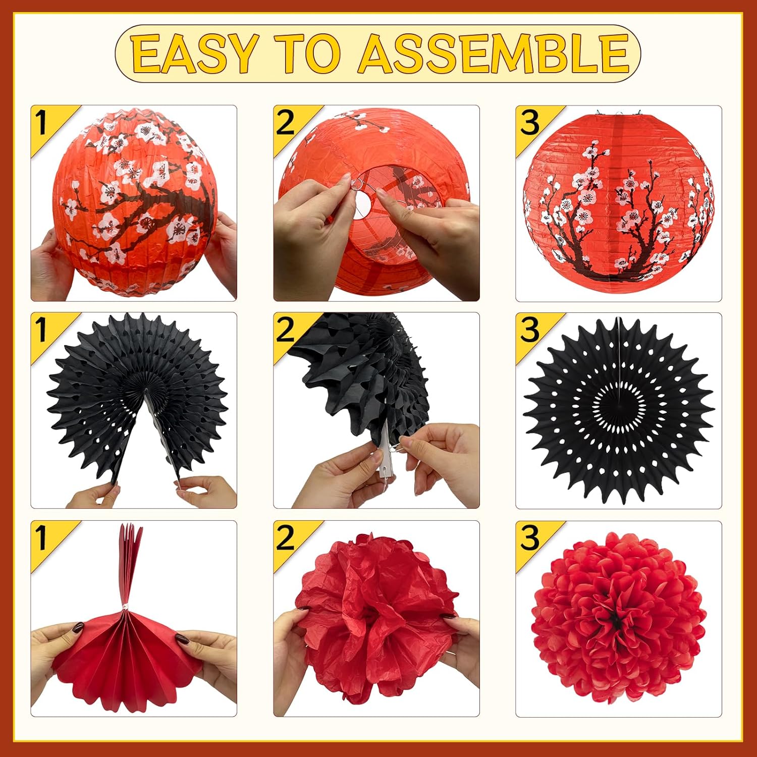 hibachi party decorations, japanese lanterns set, cherry blossom pattern, birthday party decor, paper fans and pom poms