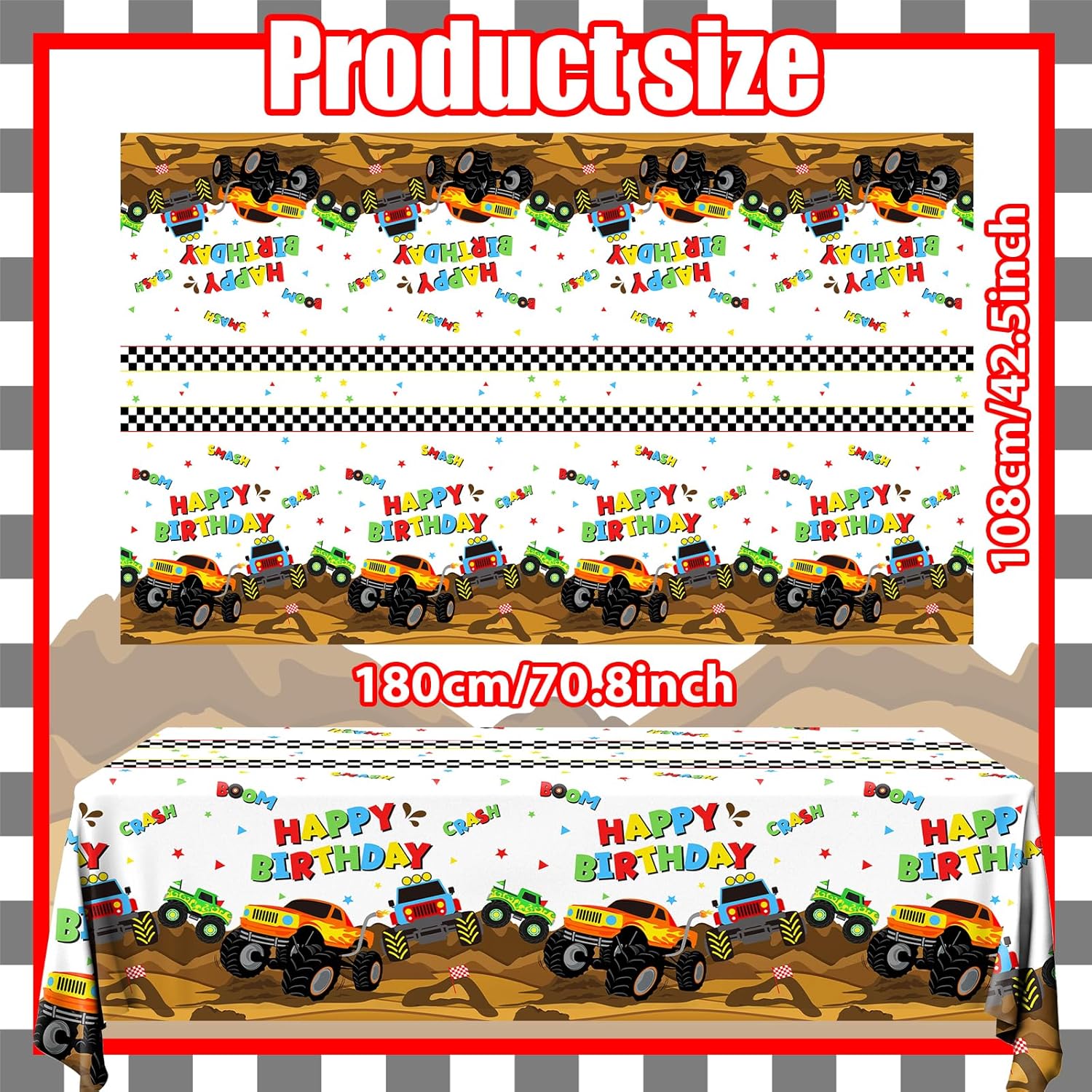 Each tablecloth in this set features a bold checkered pattern with dynamic monster truck graphics and eye-catching phrases like "Boom Crash." The vibrant colors and high-energy visuals make your event feel like a real off-road rally, no matter the venue.