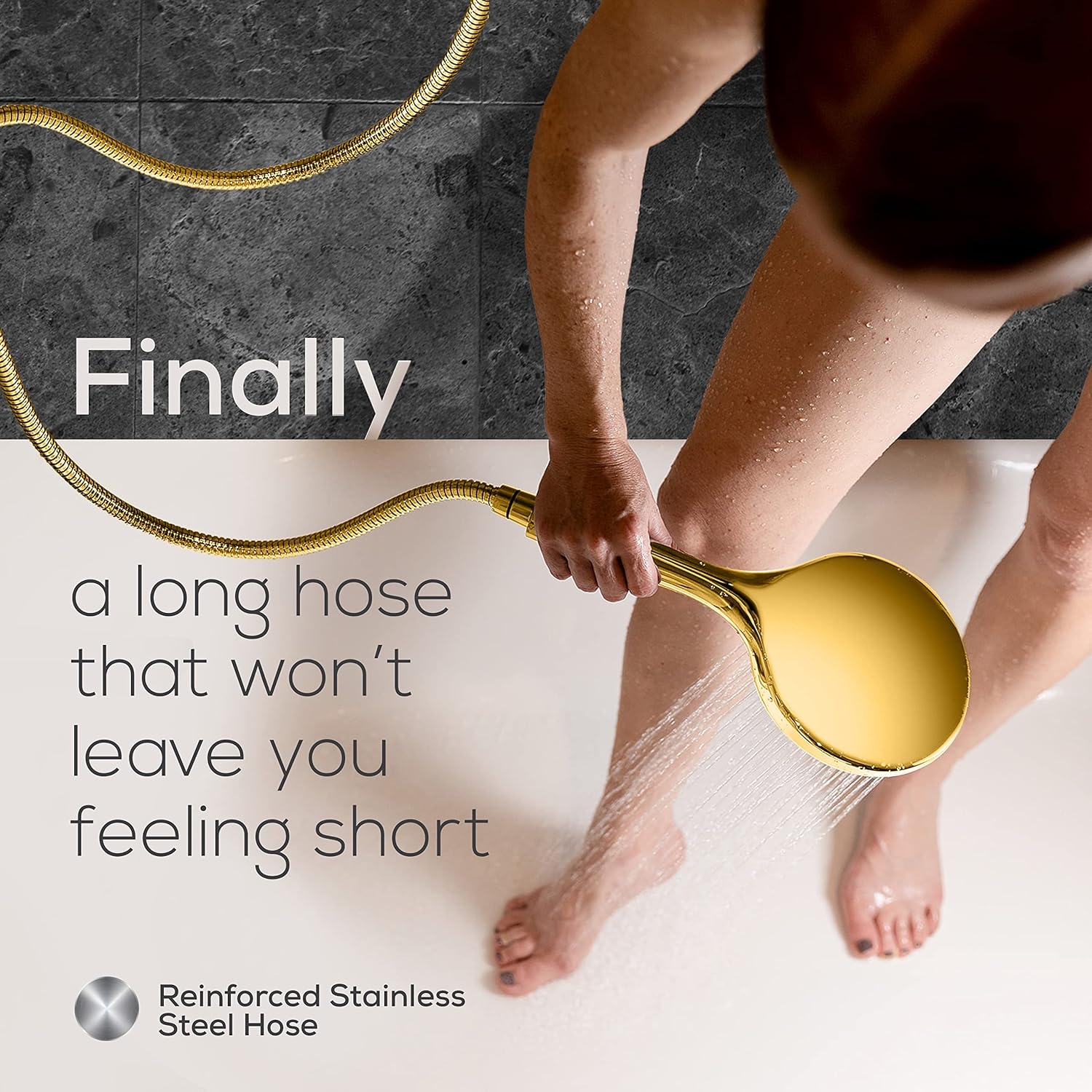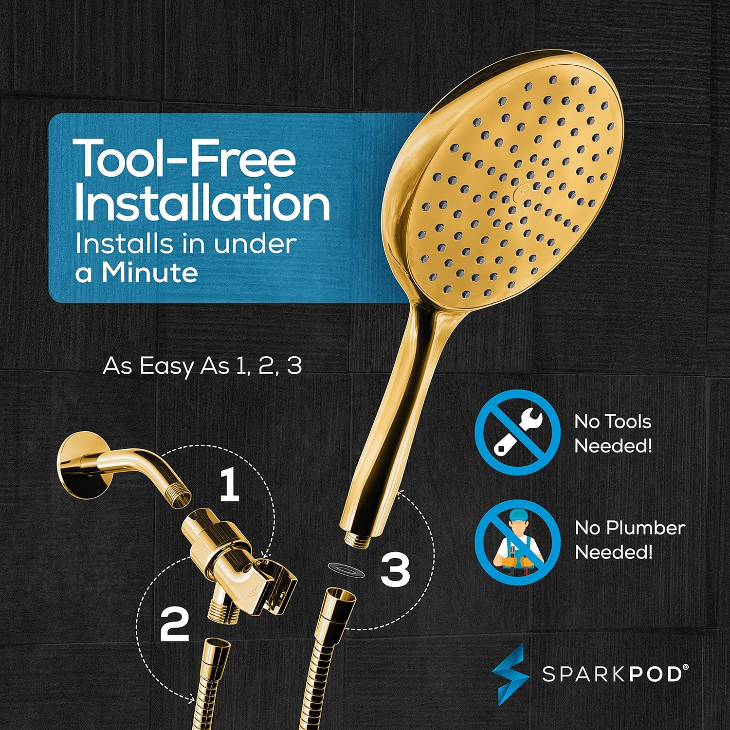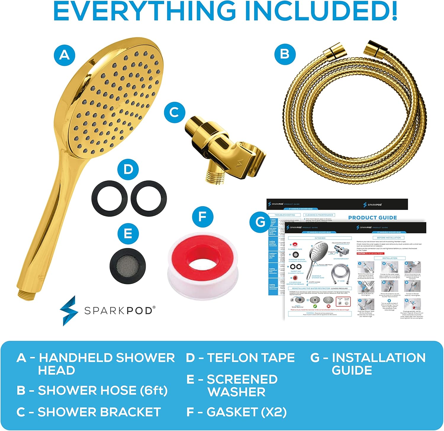 Enhance your shower experience with a sleek and luxurious design that delivers powerful, even water pressure. The 6-inch rainfall shower head offers full body coverage, making every moment in the bathroom a spa-like escape. With its 6ft. hose, installation is effortless and perfect for reaching every corner of your shower space. SparkPodâs handheld shower head is crafted to bring a touch of luxury into your daily routine. The 6-inch rainfall spray ensures a gentle yet powerful cascade, creating a spa-like atmosphere for relaxation and rejuvenation. Harness the benefits of a 6ft. hose for easy reach and enhanced usability. Built with durable brass and a high-quality chrome finish, the product is designed to last while maintaining a stylish and modern look in your bathroom. Install the SparkPod handheld shower head in just one minute using the adjustable overhead bracket. The included anti-leakage teflon tape and rubber washers ensure a secure, leak-free fit without the need for extra tools or part replacements. Whether you're a senior looking for usability, a parent wanting to make bath time easier for your child, or a pet owner needing a convenient way to groom your furry friend, SparkPod delivers an exceptional blend of comfort and performance. Its ergonomic and lightweight design ensures ease of use for all age groups and lifestyles. Upgrade your bathroom with a stylish, durable, and high-performance handheld shower head that combines luxury with practicality. Experience the perfect blend of comfort and convenience with SparkPod.Transform Your Daily Ritual with SparkPod High Pressure Handheld Shower Head