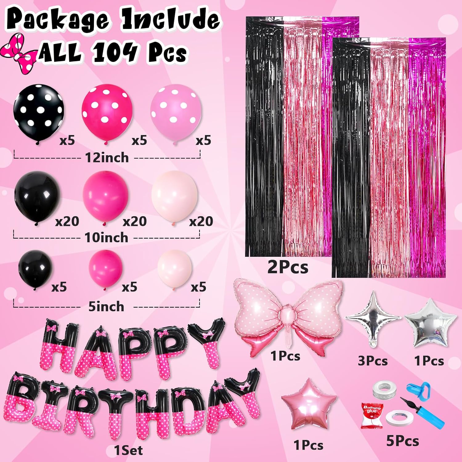 This birthday decorations kit combines fun and style with its enchanting black and pink theme. Perfect for girls' birthday parties and baby showers, it brings a sense of whimsy and joy to any setting. The set includes 104 items such as balloons, banners, and a tinsel fringe curtain, ensuring you have all the essentials for a festive and memorable event.